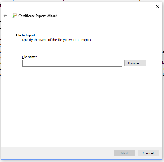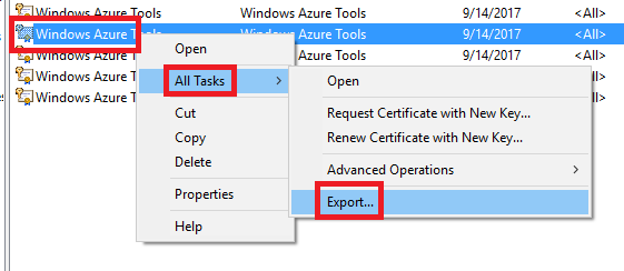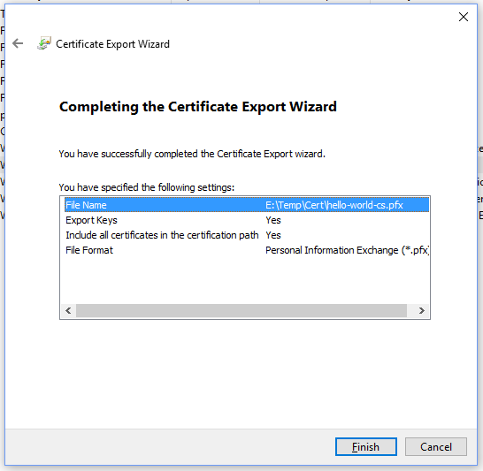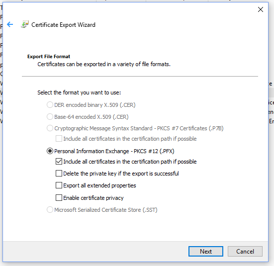 Azure Management portal expects a .PFX file. Let’s generate a .PFX file using the selected Certificate in the above screenshot.
