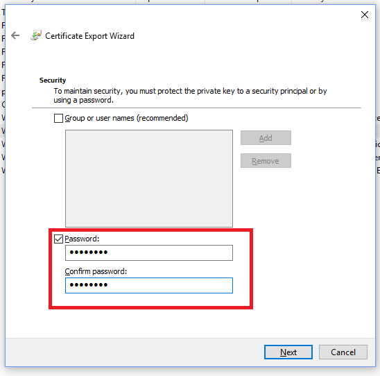 In this step, check the “Password” checkbox and provide and confirm the password. Please note this password somewhere safe. We need to provide this in the Azure Management portal while uploading the Certificate.