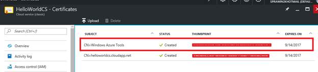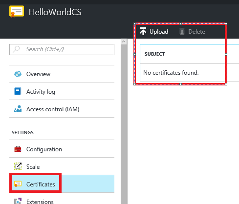 Let’s upload the .PFX file to Azure Management portal for our Cloud Service. Navigate to the Cloud Service and select “Certificates” blade, as shown below.