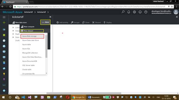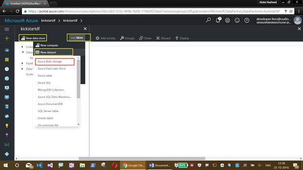 In the New Data Store blade, click on More - New Dataset - Azure Blob Storage.