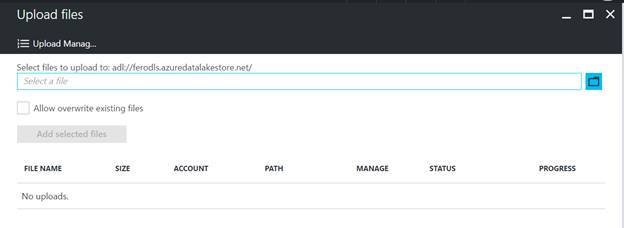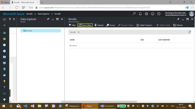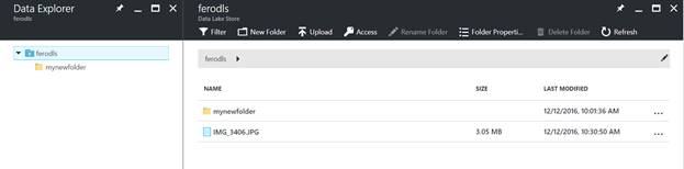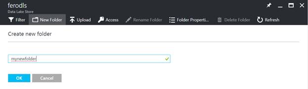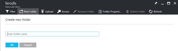 Click on "New Folder" option in the Azure Data Lake Store Blade. In my case, it is “ferodls”