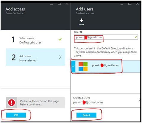Once you provide the valid account details, click on “Select” in the “Add Users” blade and then click “OK” in the “Add Access” blade.