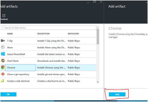 You can add multiple artifacts. For this tutorial, we will add only one article “Chrome”. Now, click “Add” in the “Add Artifact” blade and click OK in the “Add Artifacts” blade.