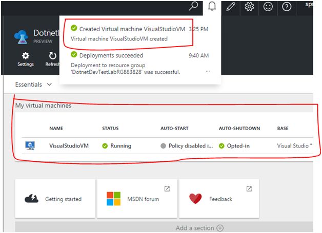 As per the above screenshot, we can see the new virtual machine named “VisualStudioVM” in the “My Virtual machines” section of the above screenshot.