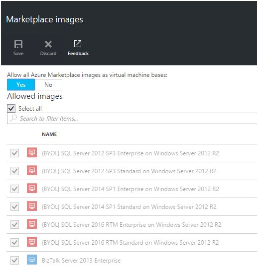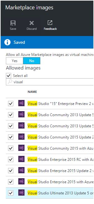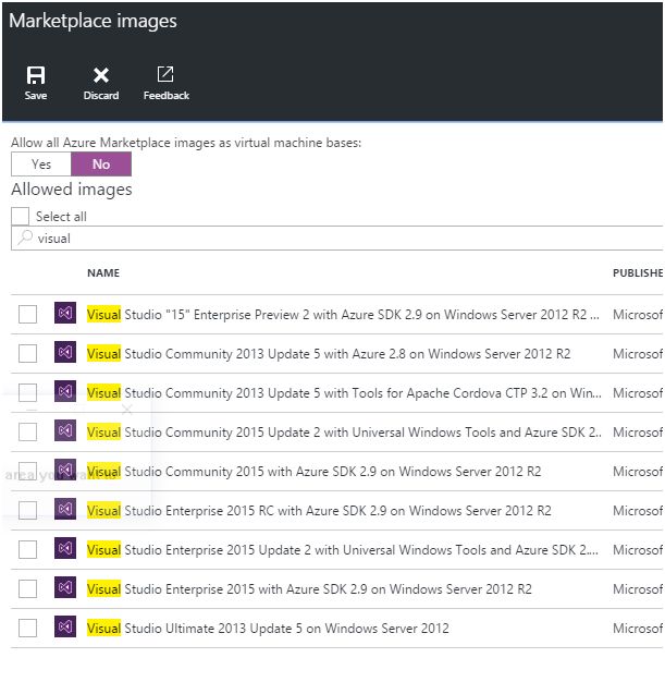 By default, all the users of the lab will be able to select any of the images available in the list. Let’s go ahead and restrict the user to creating only the images with Visual Studio.