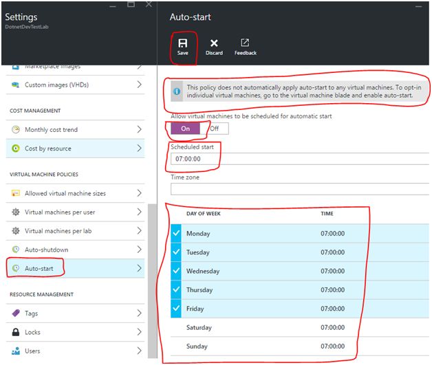Please note that “Auto-Shutdown” policy applies to all the VMs in the DevTest Lab automatically. However, the “Auto-Start” policy doesn’t apply to any of the VMs. The owner of the VM has to apply it manually by going into the settings. Probably this is something which could be discussed in a future article.