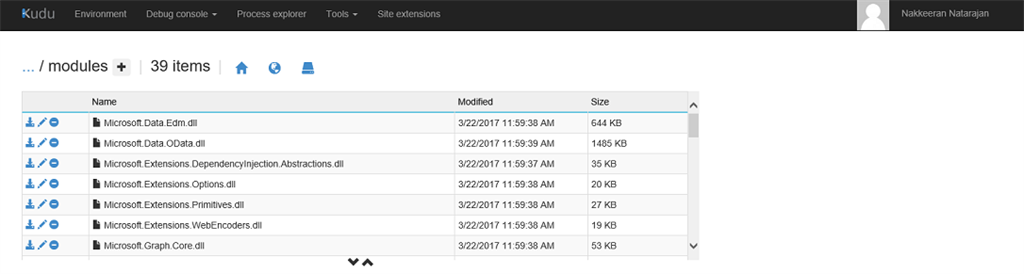 Upload the required assembly files, using Kudu tool. From the app settings page, select advanced tools under development tools and click Go. The tools page will be opened. Under debug console, select PowerShell. Navigate to the appropriate function under wwwroot folder. Create the modules folder and upload the necessary files.