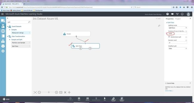 10) Now, type "split" in the search box and drag the "Split Data" module into your Experiment window. Also, connect the "iris.csv" module with the "Split Data" module by simply dragging; then set the "Fraction of rows in the first output dataset" value to "0.75".