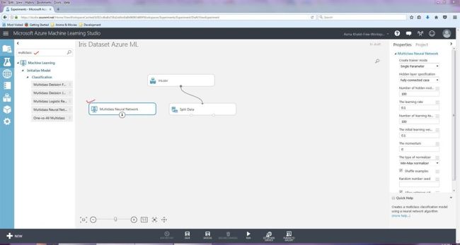 11) Now, let's add the machine learning algorithm to our Experiment. So, type "multiclass" in the search box and drag "Multiclass Neural Network" module into your Experiment window and leave the properties in the Property window as it is.