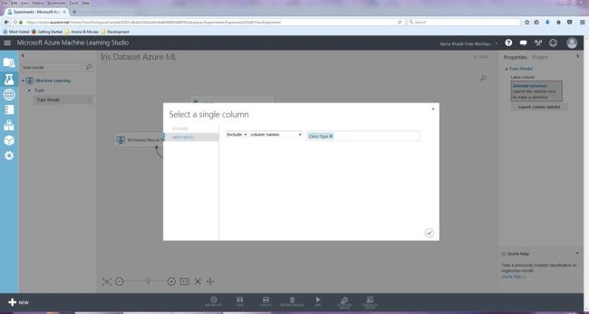 You will notice an error symbol on the "Train Model" module as shown in the above snippet. This is because we have not told our training model to train on which feature (column) of our dataset which is our predictive feature (column). So, click on the "Launch column selector" and then choose "class-type" column.