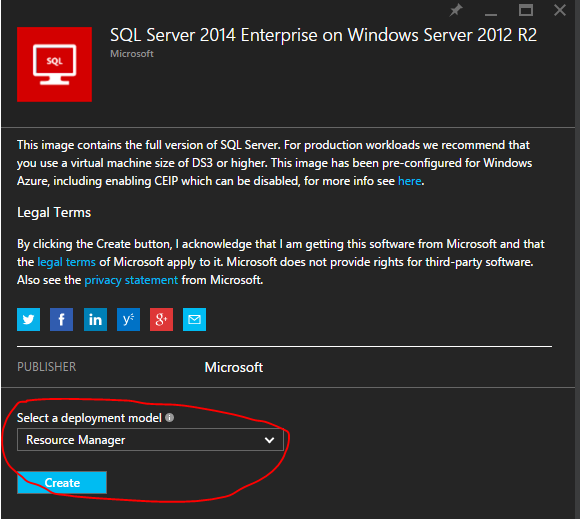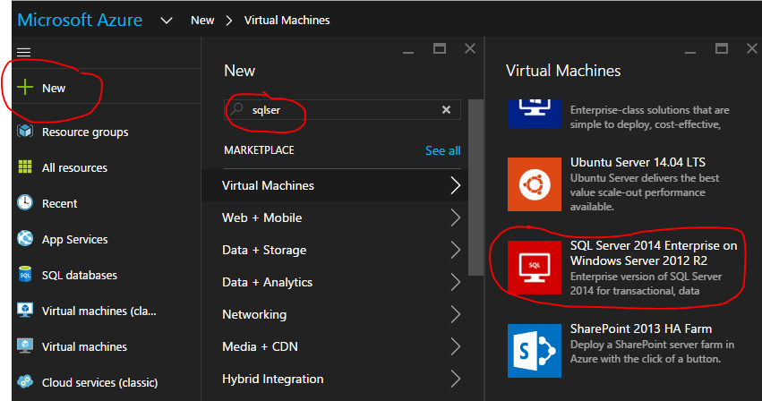 In this article we will learn how to create a Virtual Machine with SQL Server and access the SQL Server from a local SQL Server Management Studio (SSMS). Go to the Azure portal and select the required Configuration of the Virtual Machine along with the SQL Server. In this case, I selected SQL Server 2014 Enterprise on Windows Server 2012 R2 as shown below.
