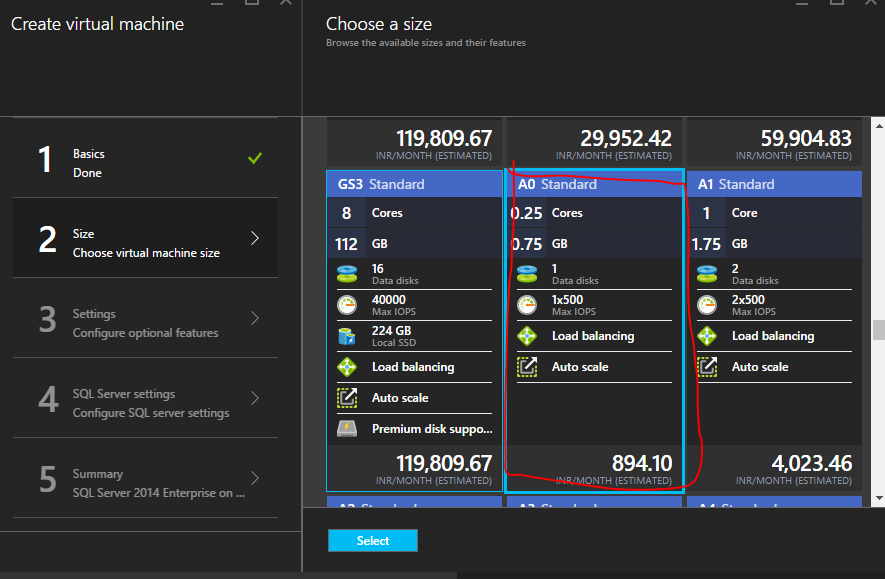 In the 2nd Step, we will select the required VM. I am selecting A0 Standard Size as shown in the below screen capture and click on "Select" button.