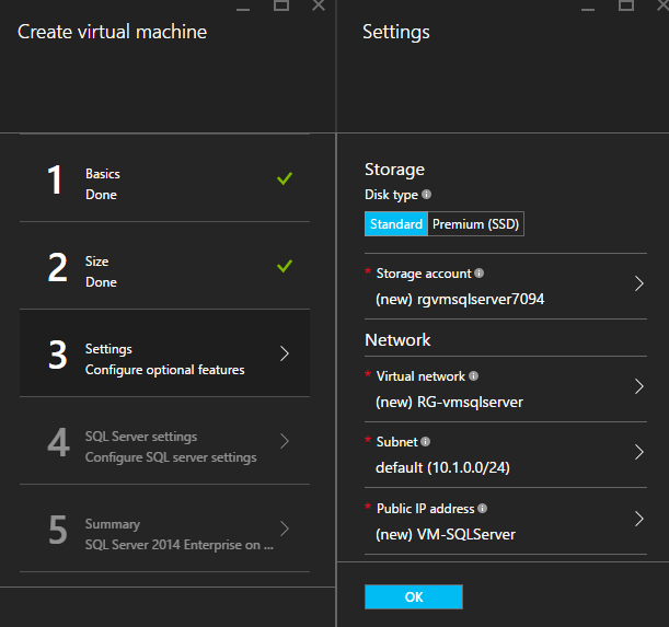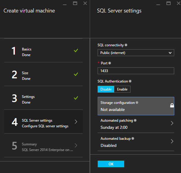 The 4th step is to provide all the details related to SQL Server. As initially mentioned, our idea is to access the SQL Server over internet, we would select "Public (Internet)" in the SQL Connectivity dropdown as shown below. we will leave all other settings and click on "OK".