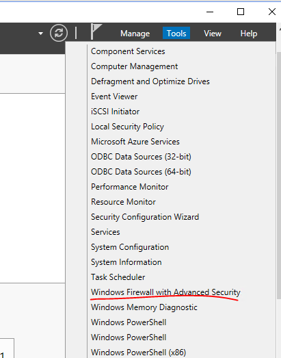Go to Server Manager and click on the "Tools -> Windows Firewall with Advanced security" as shown in the below screen shot.