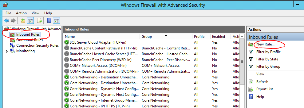 Once the "Windows Firewall with Advanced security" is opened, click on the "In Bound Rules" on the left hand side of the below screen capture. And now click on the "New Rule" button which is located in the right hand side of the following screen capture.