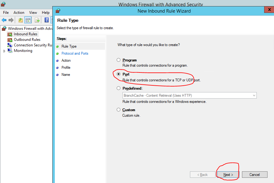 There are a couple of steps for creating the InBound rules. In the first step "Rule Type"select the "port" radio button and click on Next button as shown in the following screen capture.