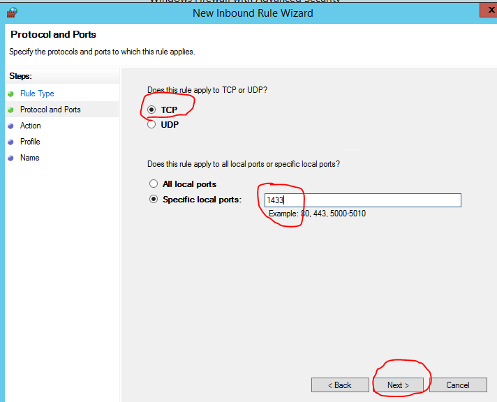 In the 2nd Step "Protocol and Port" step, select "TCP" and provide "1433" in the "Specific local ports" textbox as shown below and click on "Next" button,