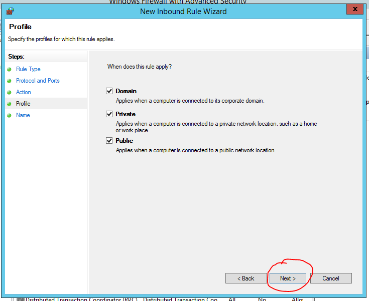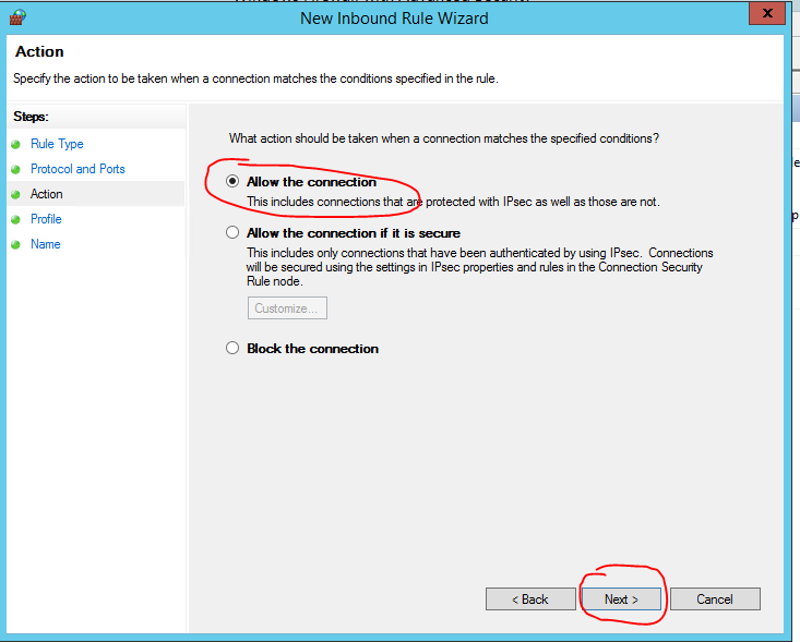 In the Action step, select "Allow the connection" radio button as shown below to allow the connections. In production environments, you might have to allow only secured connections.
