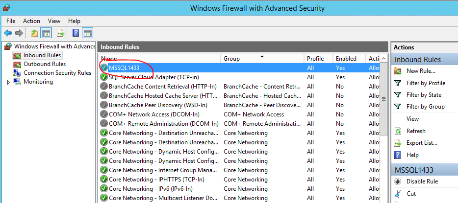 Let's configure the firewall to allow the traffic to the 1433 port in the Virtual Machine that we have just created.