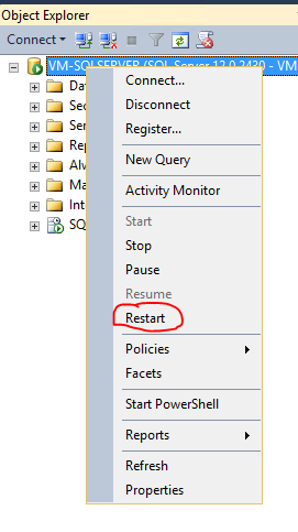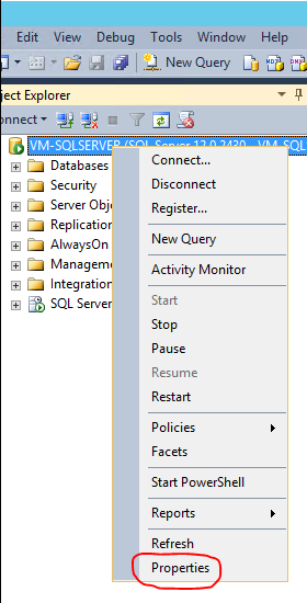 Now, in order to have our SQL Server to be connected from remote machines, we need to enable "SQL Authentication mode". Connect to the SQL Server on the Virtual Machine and go to properties as shown below.