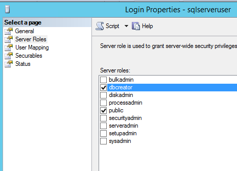 before clicking on "OK" button, select "Server Roles" located in the left hand side of the above screen capture and select "dbcreator" role as shown below,