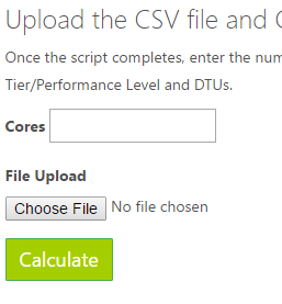 - Come back to Azure SQL Database DTU Calculator’s page. Provide the number of CPU cores of your current Server where SQL is being hosted in the “Cores” textbox shown in the below screen capture and upload the .CSV file and then click on the “Calculate” button.