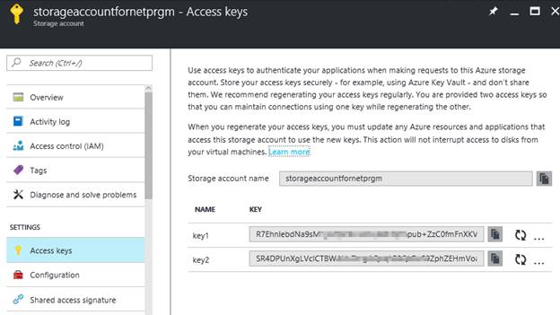 Azure provides us two Access Keys, which we can use to connect to the Storage Account programmatically. You can use either of these keys (key1 and Key2) in any of your Applications (ASP.NET Application, mobile apps, Web Services etc.) to access the Storage Accounts and perform the operations with Azure Storage Accounts.
