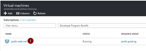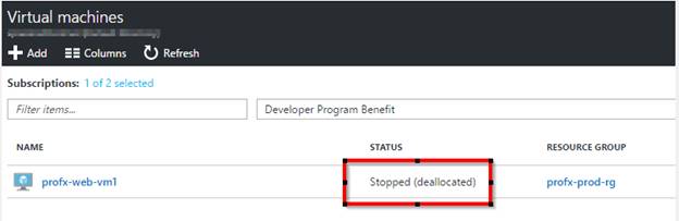 Log into your Azure account and navigate to the Virtual Machines that you would like to shut down, as shown below.
