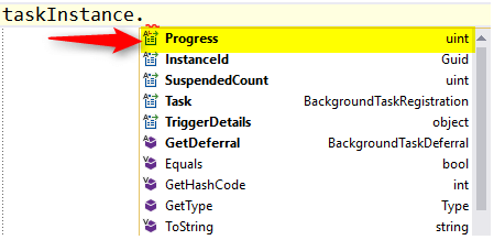 - private async void BackgroundTask_Progress(BackgroundTaskRegistration sender, BackgroundTaskProgressEventArgs args) {}