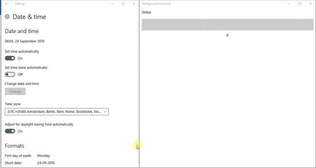 This example uses the SystemTriggerEvent register with TimeZoneChange, whenever TimeZoneChange background task will run,