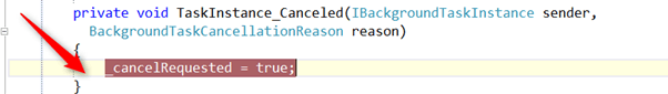 - private void TaskInstance_Canceled(IBackgroundTaskInstance sender, BackgroundTaskCancellationReason reason) {
