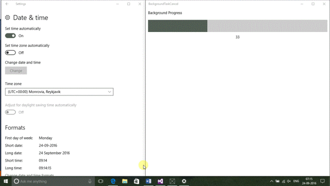 We can use the Task or Timer control to run background functionality, in this example I am using the ThreadPoolTimer & this timer will run every 2 seconds and set the progress value & automatically progress the event, get triggered and handle it in the main application.
