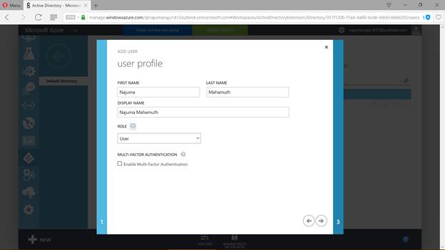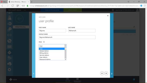 Fill in your First name, Last name, Display Name and your role. You have different roles here, as User, Global admin, Billing admin, Service admin, User admin and Password admin. Click on the Next icon once it is done.