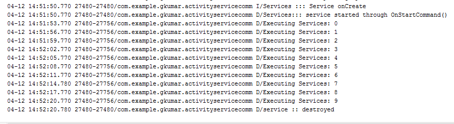 When clicking on the start button the service gets started and first onCreate () method called of service and then onStartCommand(). After call of this method all the computation will be started as shown in figure below. As we can see that after full computation up to generation of number up to 9 and then serviceis stopped because we have called stopSelf() and destroyed because we have called onDestroy() as shown in code.