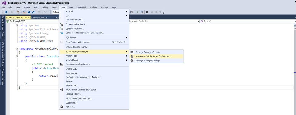 Now, we will install the jQuery datatables that we will be using to build the Grid. Go to Tools >> NuGet Package Manager >> Manage Nuget Packages for Solution and click it.