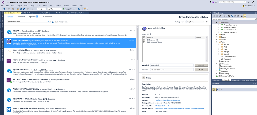 The package manager will get opened and by default it will be displaying the installed nuget packages in your solution. Click the browser button and then search for jQuery datatables package. Select it and check the projects of the solution in which you want to install this package. In our case, we are installing it in GridExampleMVC web project only as per requirement. Then, press the install button.