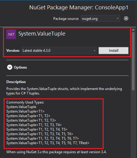 Now, select Browse for more online packages and find “System.ValueTuple” and install it.