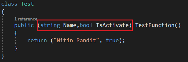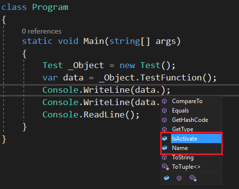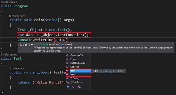 I have given a name to the first value but still I can call that by Item1 because that was on first position. Similarly, if you want to call IsActivate’s value, you can use Item2 . However, it will not be visible into Visual Studio intelliSense and you will have to type it manually.