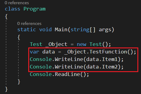 - One more way to use Tuple type - If you want to use these values returned by function individually instead of using them like an object’s property, you can hold them in a var type as in the following code and can use them individually.