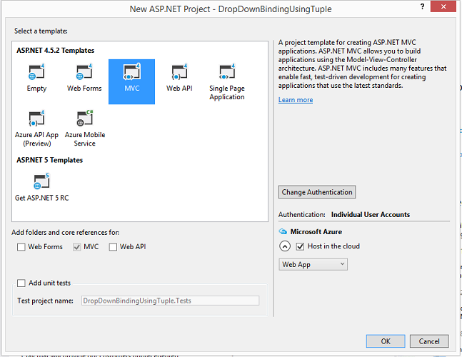 Select "web" in the left pane and select "ASP.NET Web Application" main window.Then give a name for your project and click ok. Here, I have named my project as "BindingDropDownUsingTuple".