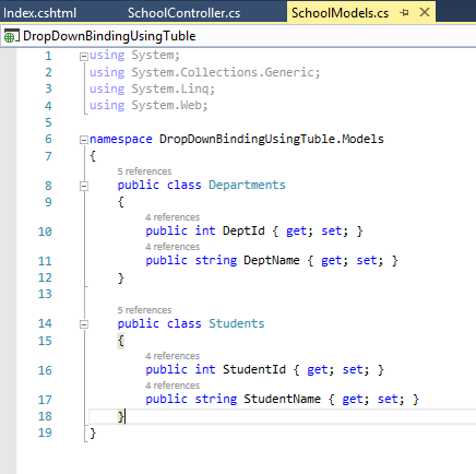 Here, I have created two classes such as "Departments" and "Students". The Departments class is used to bind the Department drop-down list and Students class is used to bind the Students' drop-down list.