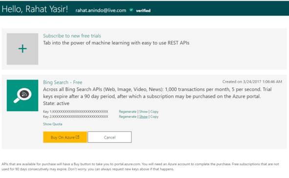 Now, select Bing News from the list given above and get API for Bing News Search API. Afterwards, you can see your Free Bing Search API information from the list given below.