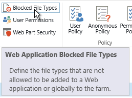 Here, you can define the file types that should be allowed or disallowed on SharePoint sites and collections. This configuration will apply globally on the complete farm.