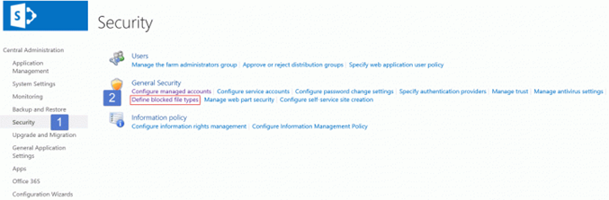 - On the Security page, in the "General Security" section, click "Define blocked file types".