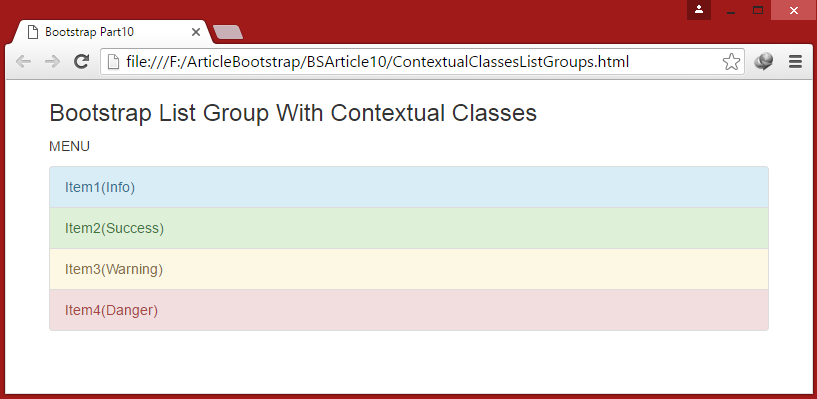 In this example we will create List Group using Contextual Classes to list group items by writing following code: