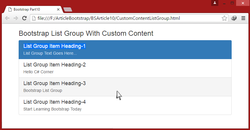 In this example we will create List Group with linked items then inside list group item we will add heading with class .list-group-item-heading and paragraph with class .list-group-item-text and see output by writing following code.