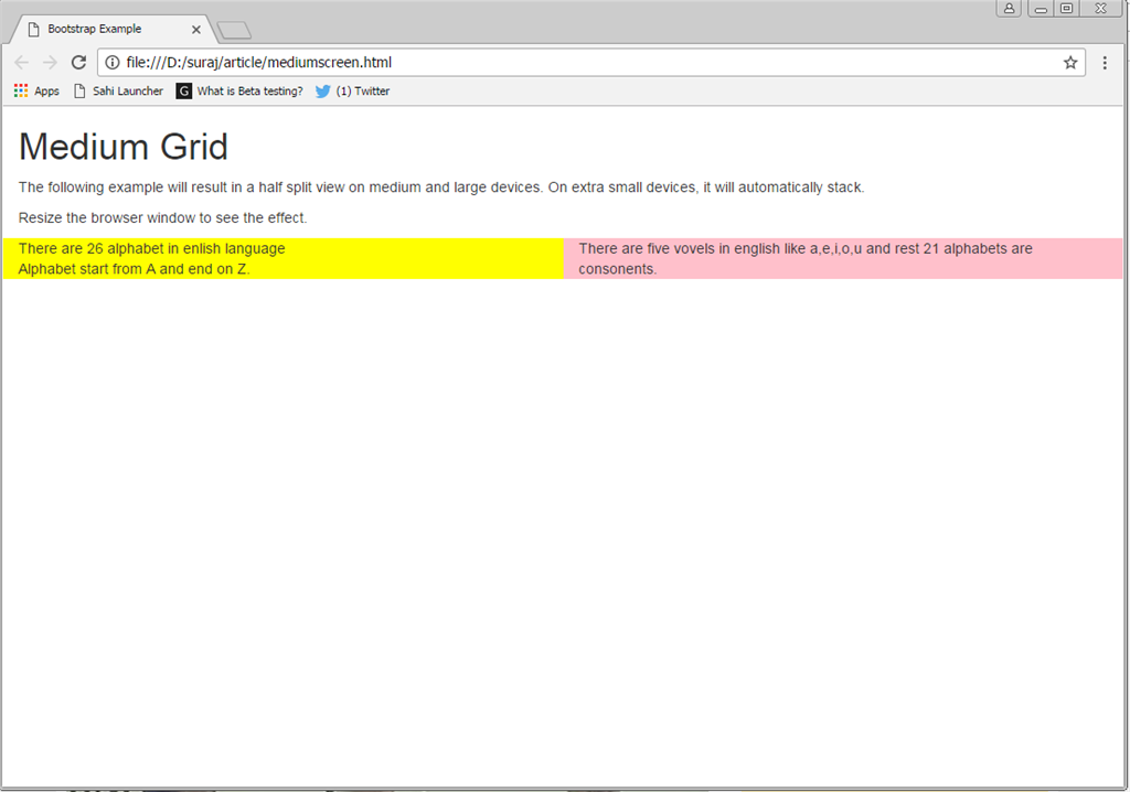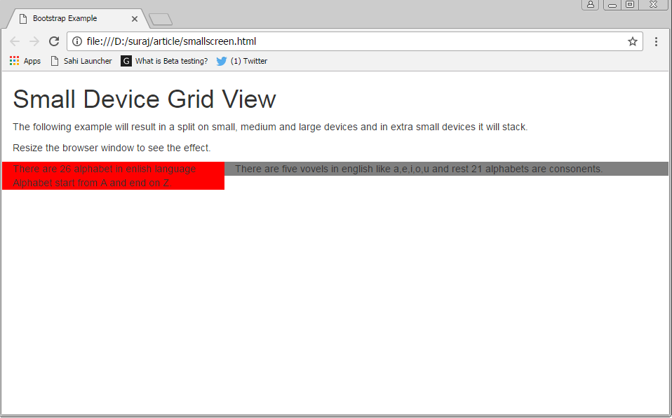 Now, we will create a two column layout in such a manner that it will show 100% of the stack on the extra small screens and will be 50-50% split on all the other screens.