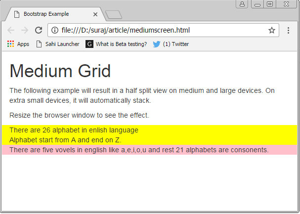 Medium devices are defined as having a screen with 992 pixels to 1192 pixels. For the medium devices, we will use .col-md* classes. Let us see a simple example of a medium device's grid view.