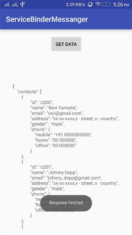 - Response Fetched in MainActivity, data received in handleMessage() of MainActivity.java as shown in code above and set it into textview.