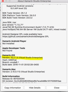 In Mac machine, go to Xamarin Studio and select Xamarin Studio Menu >> Click  	About Xamarin Studio >> click Show details.
